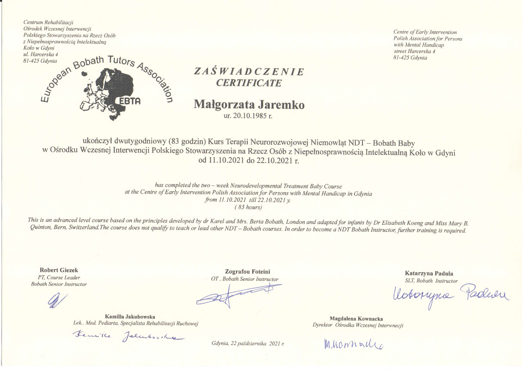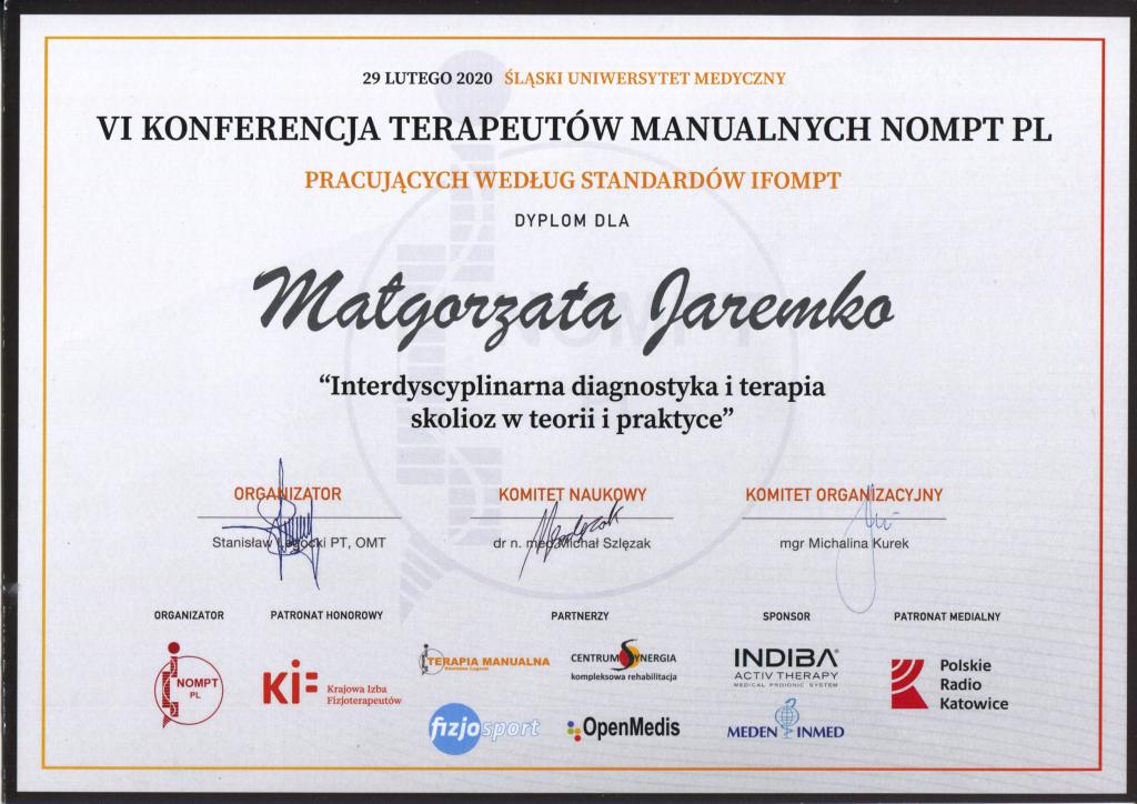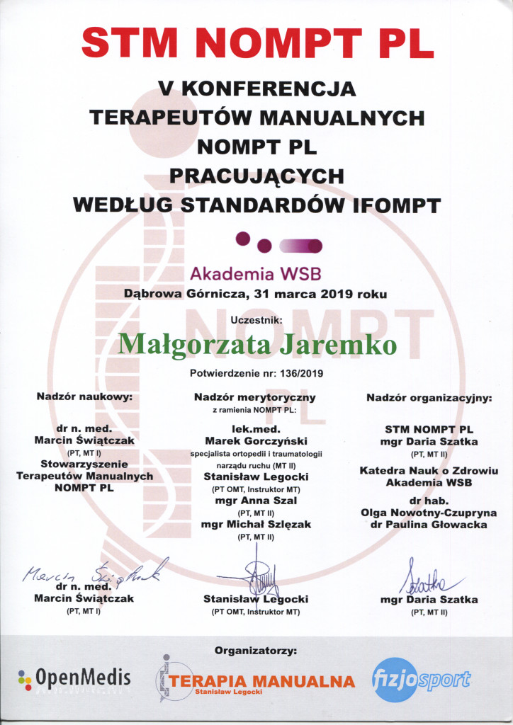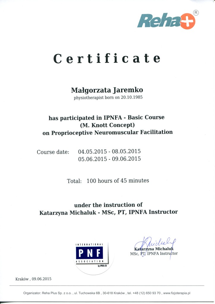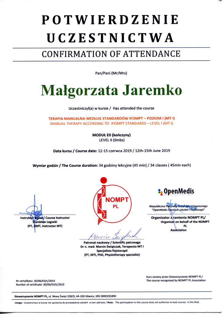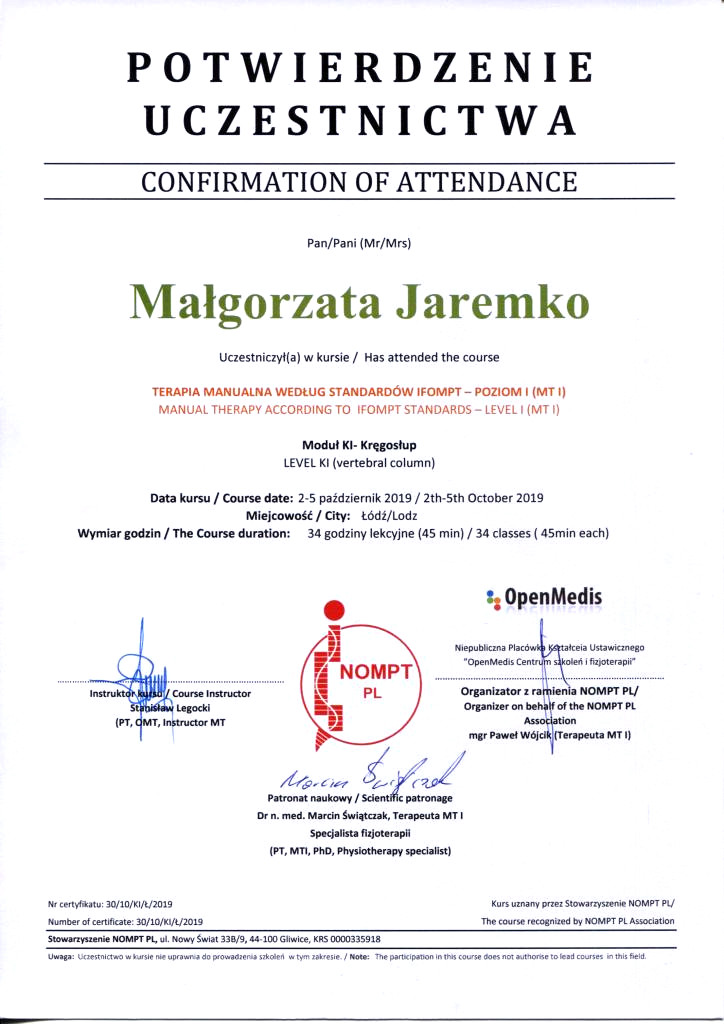 - Studia stacjonarne na kierunku fizjoterapia Wyższej Szkoły Fizjoterapii (Andrzeja Czamary) z siedzibą we Wrocławiu z wynikiem bardzo dobrym.